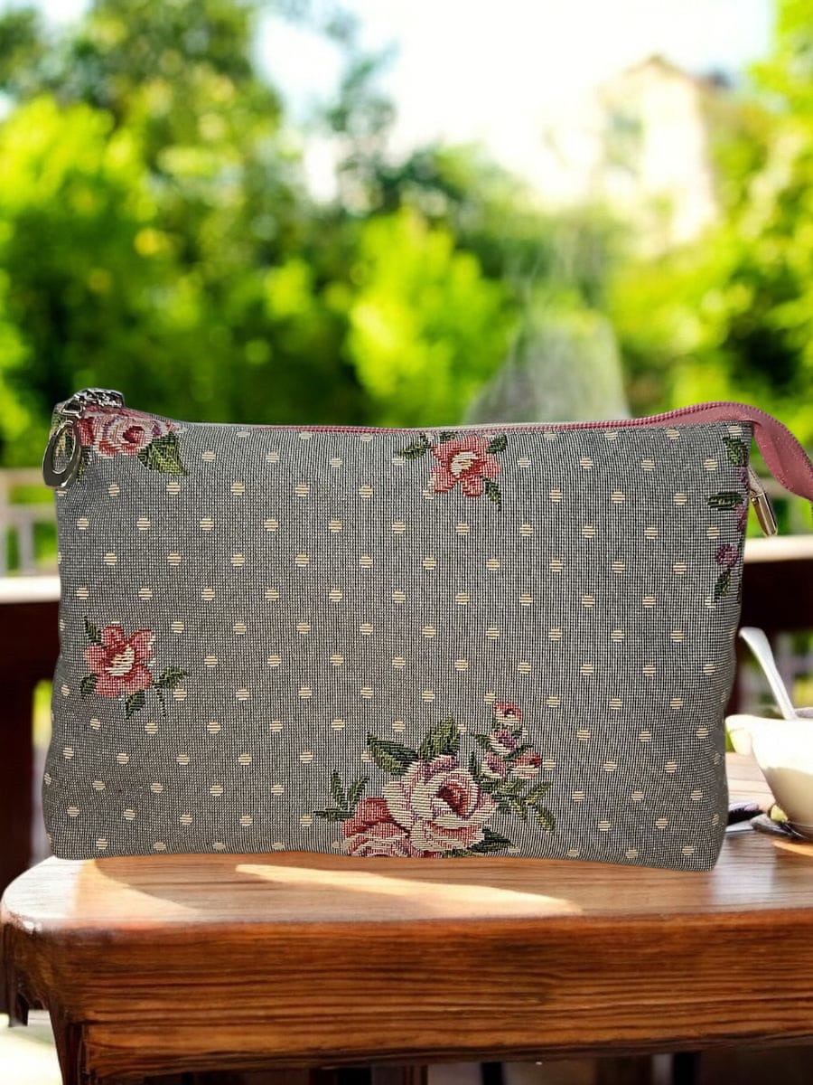 • Сумки / Косметички из гобелена - 1045 Косметичка Розы Дамаск мелкие цветы серый/горох 25х16х6 см 2520275