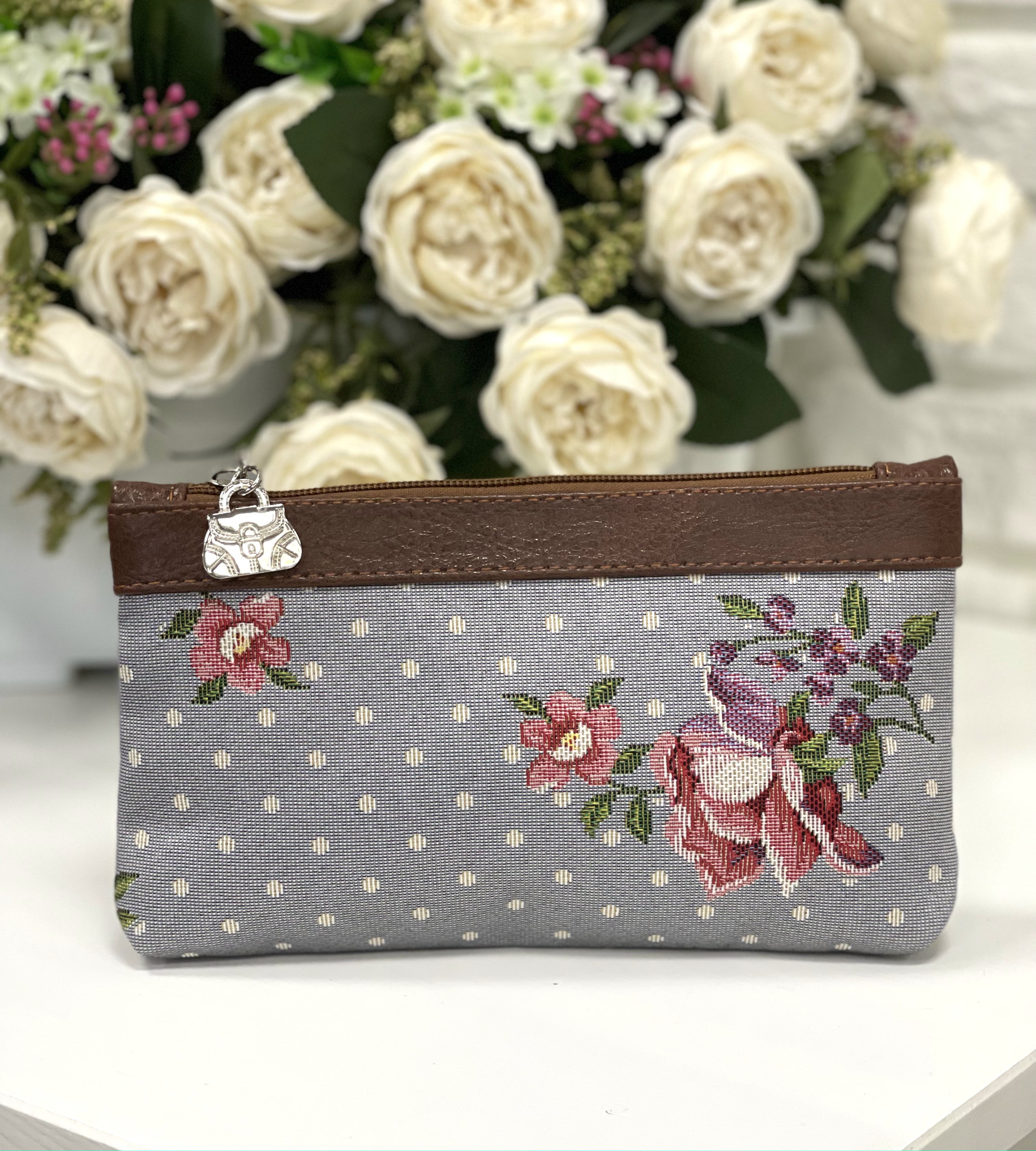 • Сумки / Косметички из гобелена - 51 Косметичка Розы Дамаск мелкие цветы сер.фон 21х14х3см 06936