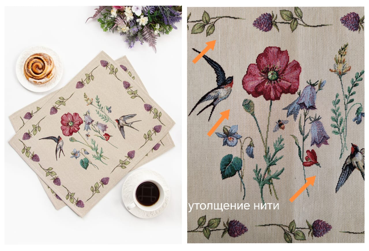 Рисунок создается переплетением нитей различных цветов и фактуры. Состав ткани: хлопок ( дающий фактуру и приятную тактильность ) и синтетические нити ( придающие износостойкость ). Плотность гобелена 410 г на кв.метр.