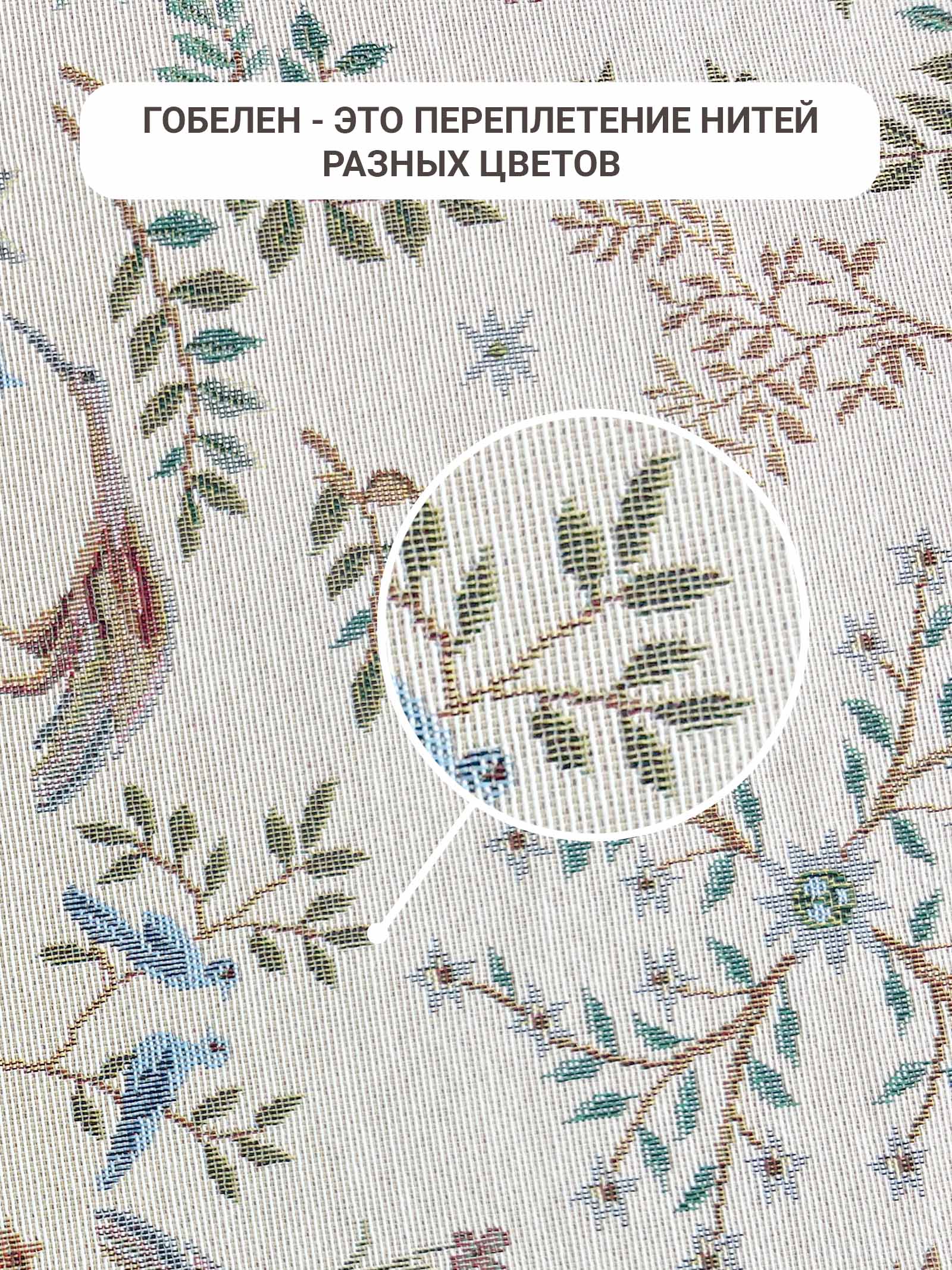 Рисунок создается переплетением нитей различных цветов и фактуры. Состав ткани: хлопок ( дающий фактуру и приятную тактильность ) и синтетические нити ( придающие износостойкость ). Плотность гобелена 410 г на кв.метр.