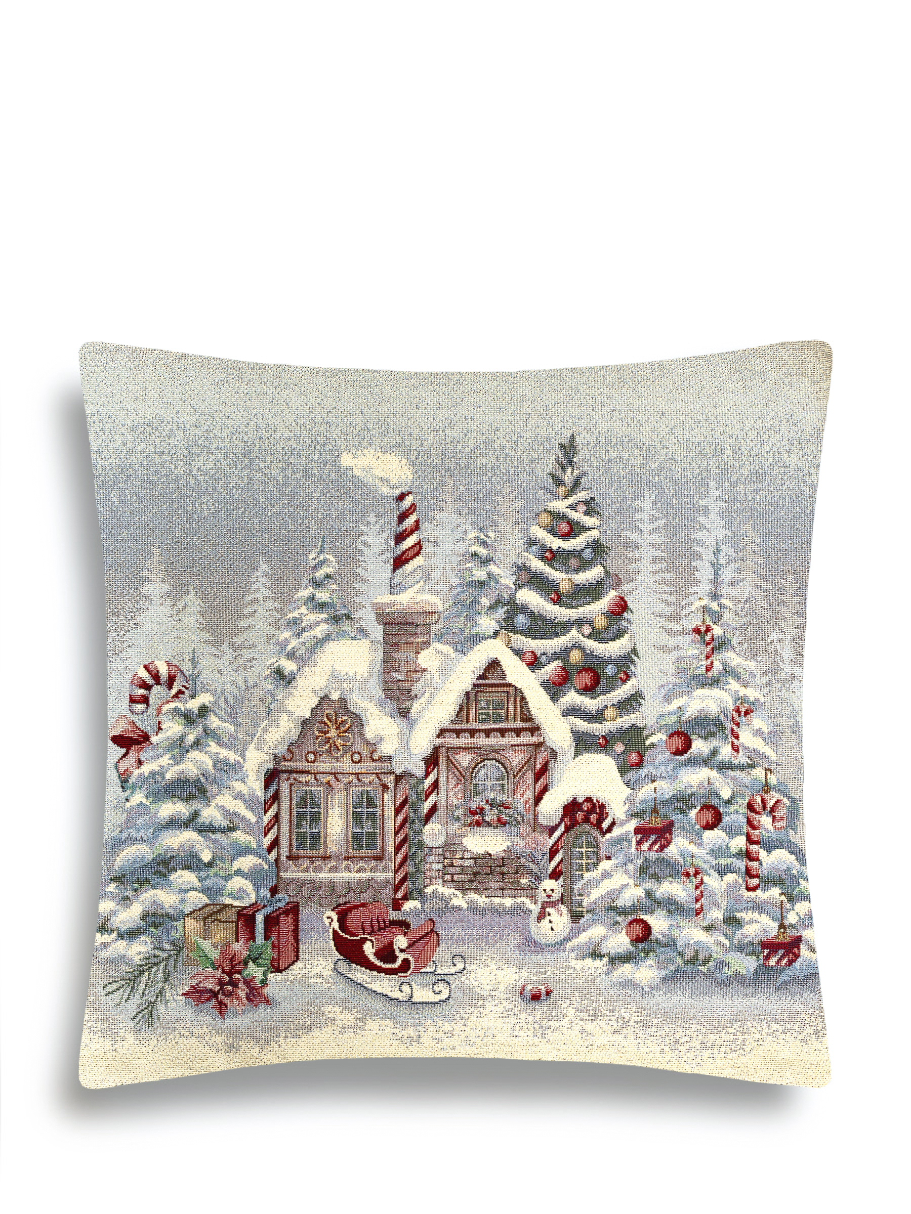 • Новогодние товары для дома / Испанская новогодняя коллекция / Снеговики NEW из гобелена - Снеговики Пряничные домики Наволочка 44х44 см 2519092 серебро NEW